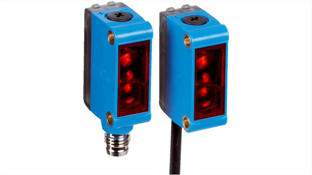 Sensore fotoelettrico rettangolare a fascio diretto, gamma di rilevamento 0 a 15 m, uscita commutazione luce/buio PNP, connettore M8 a 3 pin. Grado di protezione IP67, temperatura operativa da -25 a +55 gradi, corrente massima 100 mA, tempo di risposta 0,0005 secondi. Custodia in plastica, tecnologia SICK ASIC, LED PinPoint per allineamento preciso. Codice costruttore GSE6-P5211, marchio Sick.