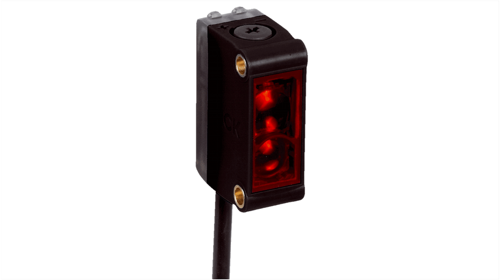 Sensore fotoelettrico miniaturizzato a soppressione di sfondo, rilevamento 240 mm, uscita PNP, cavo con connettore M12 maschio, tensione massima 30V, corrente massima 100 mA, tempo di risposta inferiore a 1 ms, grado di protezione IP67, temperatura operativa da -30°C a +55°C, alloggiamento in plastica ABS, montaggio a pannello, conforme a standard CE e cULus.