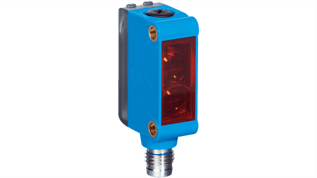 Sensore fotoelettrico rettangolare a soppressione di sfondo, gamma di rilevamento 5 mm a 250 mm, uscita PNP, connettore M8 a 3 pin, tensione massima 30V, corrente massima 100 mA, tempo di risposta 0,000625 secondi, temperatura operativa da -25°C a +55°C, grado di protezione IP67, custodia in plastica, tecnologia SICK ASIC, indicatori LED grandi e luminosi, montaggio semplice con inserti filettati in metallo. Certificazioni CE e UL.