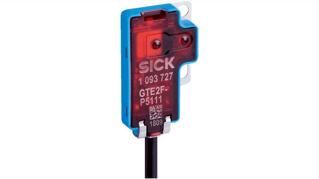 Sensore fotoelettrico rettangolare, rilevamento da 1 a 30 mm, uscita NPN, alloggiamento ultrasottile in plastica VISTAL, grado di protezione IP67, corrente massima 30 mA, tensione massima 30V, tempo di risposta 0,5 ms, temperatura operativa da -25 a +55 gradi Celsius, montaggio filettato, LED di indicazione, conforme a CE e cURus. Codice costruttore GTE2F-N1131, marchio Sick.