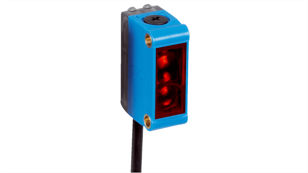 Sensore fotoelettrico rettangolare, rilevamento 250 mm a 300 mm, uscita commutazione luce/buio PNP, tensione massima 30V, corrente massima 100 mA, tempo di risposta 0,00125 secondi, grado di protezione IP67, temperatura operativa da -25°C a +55°C, contenitore in plastica ABS, connettore M12 a 4 pin. Serie G6, progettato per applicazioni industriali e ambienti difficili.