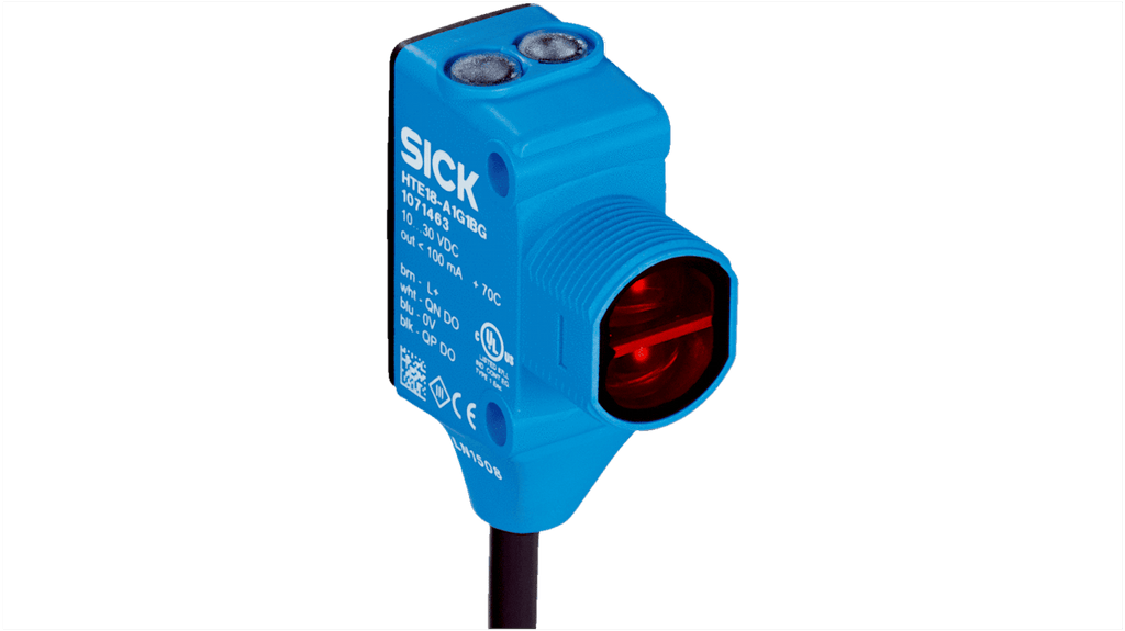 Sensore fotoelettrico rettangolare a retroriflessione, rilevamento fino a 6,5 m, uscita PNP, commutazione luce/buio, connettore maschio a 4 pin M8, tensione massima 30V, corrente massima 100 mA, tempo di risposta 0,5 ms, grado di protezione IP67, temperatura operativa da -40°C a +70°C, custodia in plastica, serie HL18, conforme a CE e cULus.