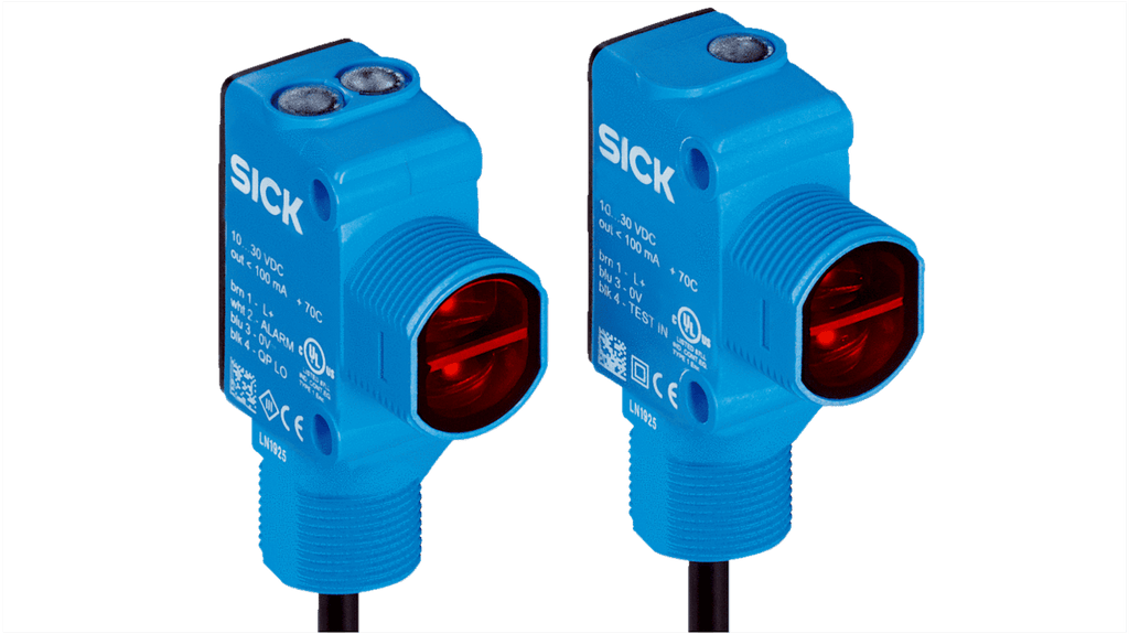 Sensore fotoelettrico rettangolare, rilevamento attraverso il fascio fino a 25 m, uscita PNP, connettore M12 maschio a 4 pin, tensione massima 30V, corrente massima 100 mA, tempo di risposta 0,5 ms, grado di protezione IP67, temperatura operativa da -40 a +70 gradi, custodia in plastica, standard CE e cULus, montaggio a pannello.