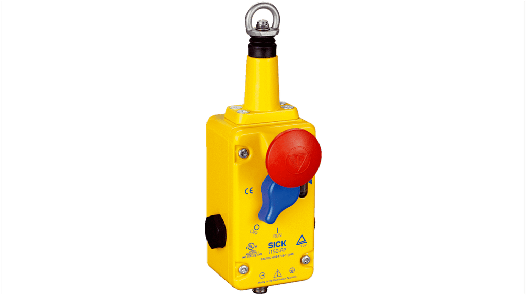 Interruttore a fune Sick i150, cavo da 75 m, 2NC, custodia in metallo, dimensioni 69 x 203 x 85 mm, protezione IP65, corrente massima 2 A, tensione massima 24 V cc, temperatura operativa da -25 a +80 gradi Celsius, leva di sblocco rotante, pulsante di arresto di emergenza integrato, compatibile con pressacavo M20 o connettore M12, standard CE.