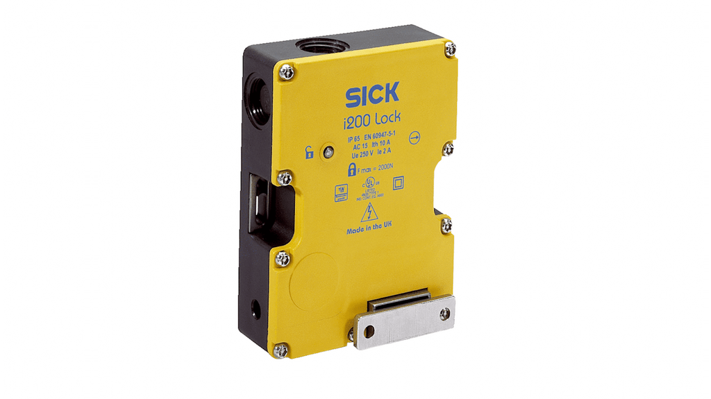 Interruttore di interblocco a solenoide, tensione 24V cc, configurazione 2NA/3NC, robusta testa in metallo, attuatori rigidi, mobili o a bullone, tre pressacavi con ingresso cavo M20 x 1,5, indicatore LED di bloccaggio, monitoraggio porte e serrature, progettato per protezioni girevoli, scorrevoli o rimovibili, elevata affidabilità e connettività elettrica flessibile. Codice costruttore: i200-M0323Lock, marchio: Sick.