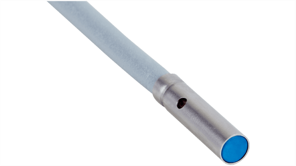 Sensore di prossimità induttivo cilindrico, NPN, rilevamento 1 mm, tensione di alimentazione 10-30 V CC, corrente di commutazione 100 mA, frequenza di commutazione massima 8000 Hz, grado di protezione IP67, temperatura operativa da -25 a +70 gradi Celsius, alloggiamento in acciaio inox V2A, montaggio a filo, cavo con connettore M8, tecnologia IO-Link, dimensioni 12 mm di lunghezza e 3 mm di larghezza.