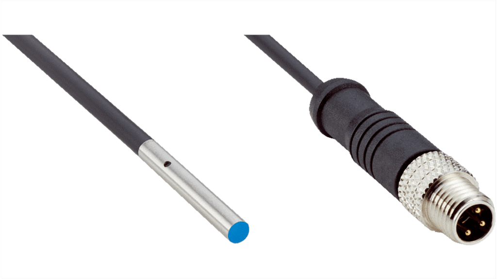 Sensore di prossimità induttivo cilindrico, PNP, gamma di rilevamento 0,6 mm, tensione di alimentazione 10-30 V CC, grado di protezione IP67, temperatura operativa da -25 a +70 gradi, montaggio a filo, corpo in acciaio inox V2A, frequenza di commutazione 5 kHz, corrente di commutazione 100 mA, cavo con connettore M8, schermato, protezione sovraccarico e corto circuito, protezione da inversione di polarità.