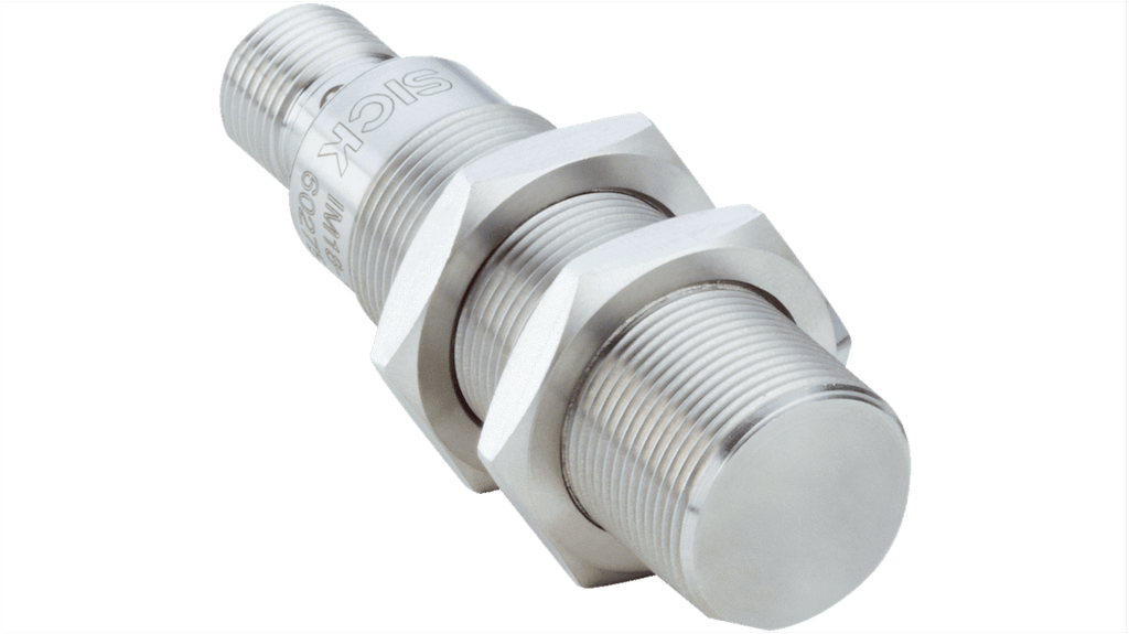 Sensore di prossimità induttivo cilindrico, tecnologia induttiva, PNP, M18 x 1, gamma di rilevamento 10 mm, tensione di alimentazione 30 V CC, corrente di commutazione 200 mA, frequenza di commutazione 200 Hz, grado di protezione IP67, temperatura operativa da -25 a +75 gradi, contenitore in ottone nichelato, superficie di rilevamento in plastica, montaggio a filo, connettore a 4 pin M12.