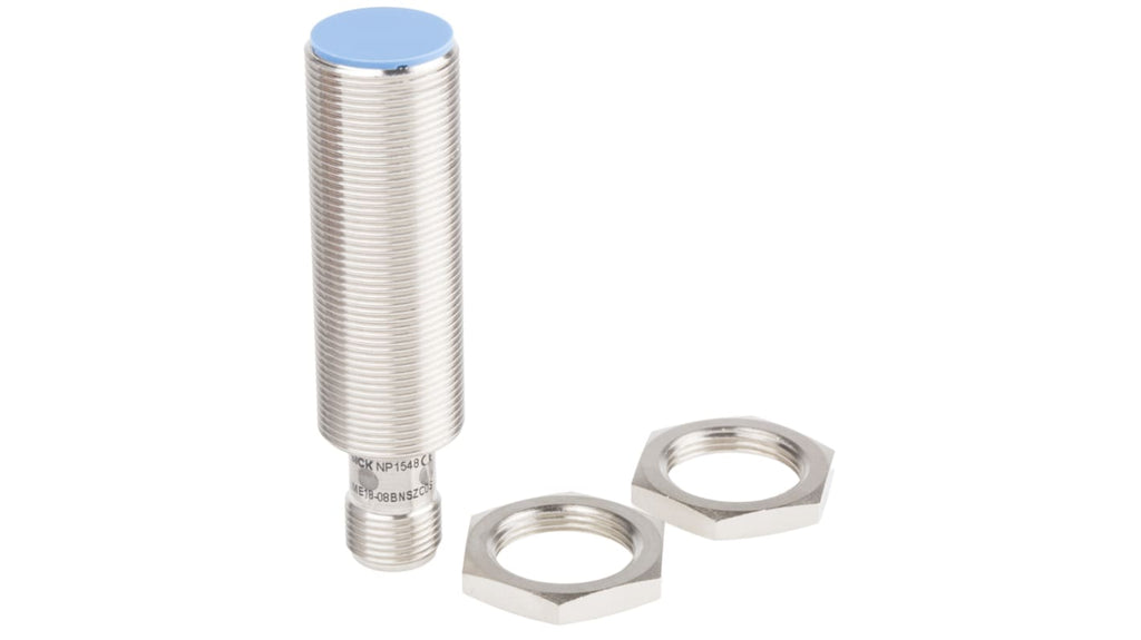 Sensore di prossimità induttivo cilindrico, NPN, M18 x 1, rilevamento 8 mm, tensione di alimentazione 10-30 V c.c., corrente di commutazione 200 mA, grado di protezione IP67, custodia in ottone nichelato, connettore M12 a 4 pin, temperatura operativa da -25 a +75 gradi Celsius, frequenza di commutazione massima 1 kHz, schermato, protezione da inversione di polarità e sovraccarico.