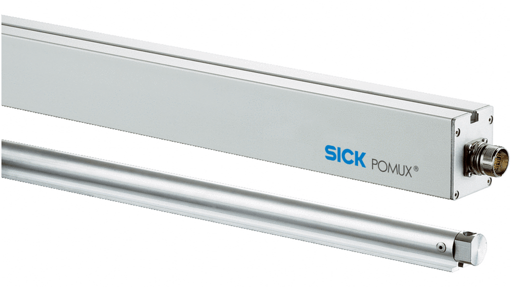 Encoder di misurazione lineare senza contatto Sick, modello POMUX KH53, misura lunghezze assolute fino a 1700 m, alta risoluzione 0,1 mm, riproducibilità 0,3 mm/1 mm, interfacce SSI e PROFIBUS, tolleranza distanza testina 55 mm, velocità di traslazione fino a 6,6 m/s, alimentazione 10-32 V. Ideale per applicazioni in ambienti difficili, esente da manutenzione.