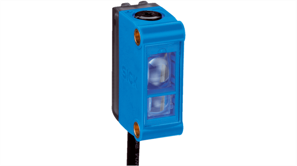 Sensore di contrasto. Rilevamento 12,5 mm, uscita NPN e PNP, corrente massima 50 mA, frequenza di commutazione 10 kHz, tensione di alimentazione 12-24 V c.c., grado di protezione IP67, temperatura operativa da -10 a +55 gradi Celsius, alloggiamento in plastica, cavo con connettore maschio M12, display di stato a LED. Applicazioni nel settore dell'imballaggio e rilevamento registri di stampa. Codice costruttore KTM-MB31112P. Marchio Sick.