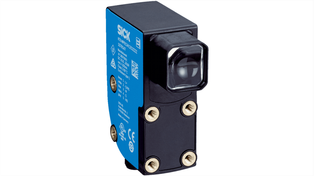 Sensore di contrasto Sick KTX, rilevamento 40 mm, LED RGB, uscita PNP, corrente massima 100 mA, frequenza di commutazione 50 kHz, tensione di alimentazione 10,8-28,8 V dc, grado di protezione IP67, temperatura operativa da -20 a +60 gradi, montaggio su circuito stampato, connettore M12 maschio, alloggiamento in plastica, display a LED, tecnologia TwinEye, modalità colore, funzioni IO-Link.