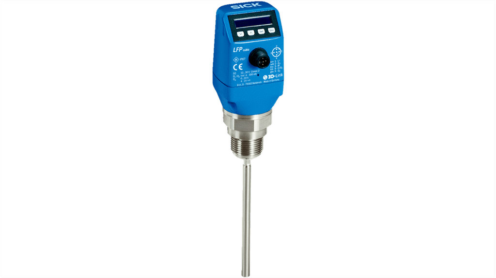 Sensore di livello TDR Sick serie LFP2000, uscita interruttore NPN e PNP, corpo in plastica PBT, lunghezza cavo 2m, temperatura operativa da -20 a +60 gradi Celsius, tensione massima 12-30V, corrente nominale 100 mA, dimensione filetto M12, pressione massima 10 bar, collegamento al processo tramite sonda, conforme agli standard CE.