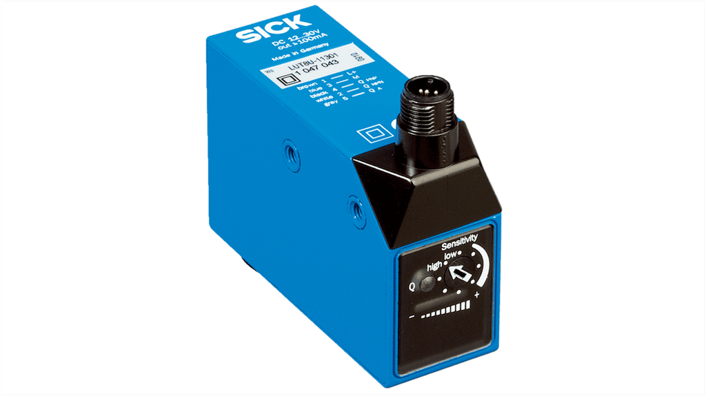 Sensore intensità luce Sick, rilevamento 50 mm, uscita NPN e PNP, corrente massima 100 mA, frequenza di commutazione 2,5 KHz, tensione di alimentazione 10-30 V c.c., grado di protezione IP67, temperatura operativa da -10 a +55 gradi Celsius, robusto contenitore in metallo, display a istogramma, regolazione della sensibilità in 8 fasi, collegamento tramite connettore maschio M12 a 5 pin.