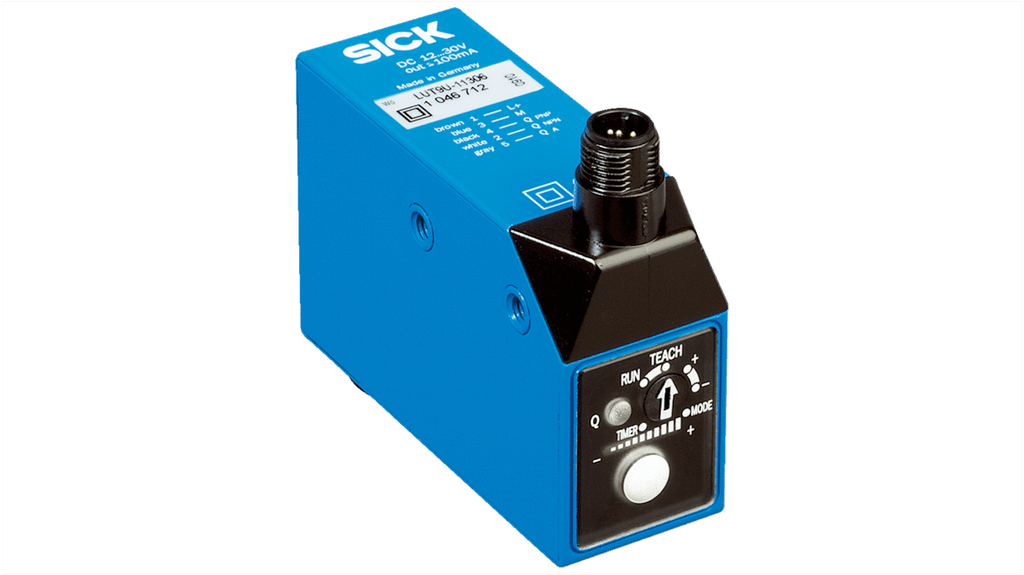 Sensore di intensità luce Sick, gamma di rilevamento 150 mm, uscita NPN e PNP, corrente massima 100 mA, frequenza di commutazione 6,5 kHz, tensione di alimentazione 10-30 V c.c., grado di protezione IP67, temperatura operativa da -10 a +55 gradi Celsius, connettore maschio M12 a 5 pin, custodia in metallo, display a istogramma per monitoraggio intensità luminescenza, versione con io-link per configurazione remota.