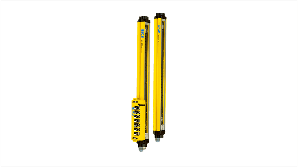 Barriera fotoelettrica a fascio multiplo, serie M40E, tre fasci, risoluzione 400mm, altezza di protezione 800mm, campo di rilevamento 0.5-70m, tempo di risposta massimo 10ms, tensione di alimentazione 24V c.c., connettore M12, dimensioni 972x55.5x52mm, tipo di sicurezza Modulo 4, SIL3, PL e, robusto alloggiamento con scanalature di montaggio su tre lati, aiuto per l'allineamento laser integrato.