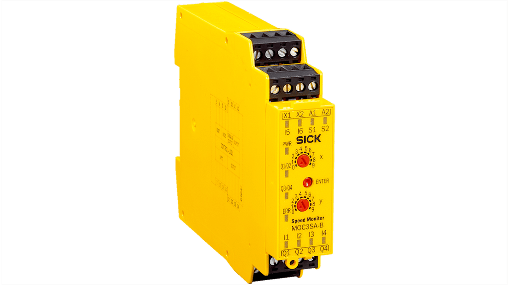 Controller di sicurezza Sick MOC3SA, 24 V, monitoraggio della velocità zero e dell'azionamento, 4 uscite sicure a semiconduttore, categoria di sicurezza 4, SIL 3, tensione di alimentazione 24 V, grado di protezione IP20/IP40, dimensioni 22,5 x 96,5 x 121 mm, frequenza d'ingresso massima 2 kHz, limite di monitoraggio regolabile da 0,1 a 99 Hz, 2 uscite di diagnostica, LED di diagnostica.