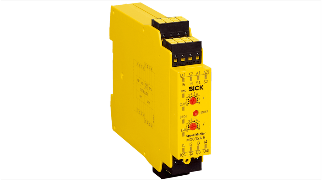 Controller di sicurezza Sick MOC3SA, 24 V, monitoraggio della velocità zero e dell'azionamento, 4 uscite sicure a semiconduttore, categoria 4, SIL 3, tensione di alimentazione 24 V, grado di protezione IP20/IP40, dimensioni 22,5 x 106,5 x 121 mm, frequenza d'ingresso massima 2 kHz, limite di monitoraggio regolabile da 0,1 a 99 Hz, 2 uscite di diagnostica, LED di diagnostica.