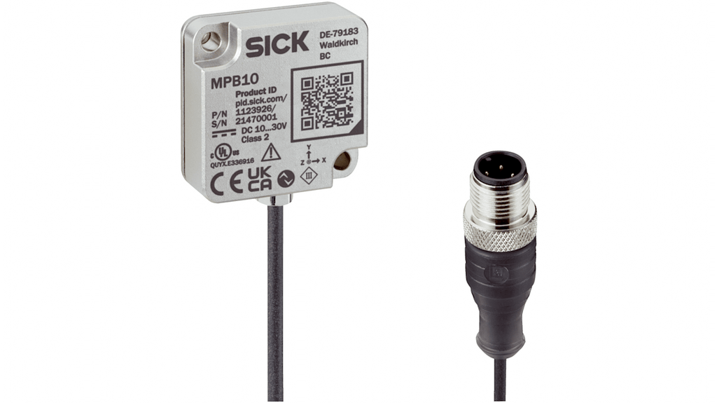 Sistema per il monitoraggio della produzione, sensore con 3 assi, gamma di frequenza 0,78-3200 Hz, filtro passa-banda parametrizzabile 1-3200 Hz, grado di protezione IP68, approvazione UL e CE, protezione contro inversione di polarità e cortocircuiti, interfaccia IO-Link, 2 uscite di commutazione, archiviazione su cloud, montaggio a vite diretto, tipo sensore analogico/digitale, serie MPB10.
