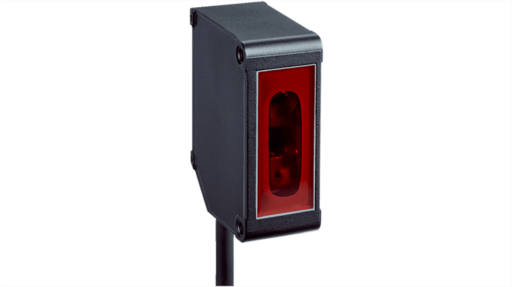 Sensore di distanza rettangolare. Rilevamento da 50 a 150 mm, uscita PNP/NPN, tensione massima 24V, corrente massima 20 mA, tempo di risposta 2 ms. Grado di protezione IP67, temperatura operativa da -10 a +50 gradi Celsius. Alloggiamento in metallo, montaggio filettato, conforme a CE e cURus. Sorgente di luce laser, collegamento elettrico tramite cavo con connettore.