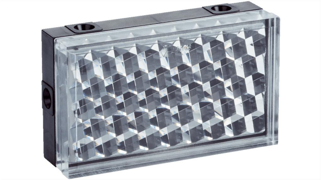 Accessorio rettangolare con attacco a vite, riflettore, serie P, montaggio avvitabile. Materiale in PMMA/ABS, temperatura operativa da -20 a +65 gradi Celsius.