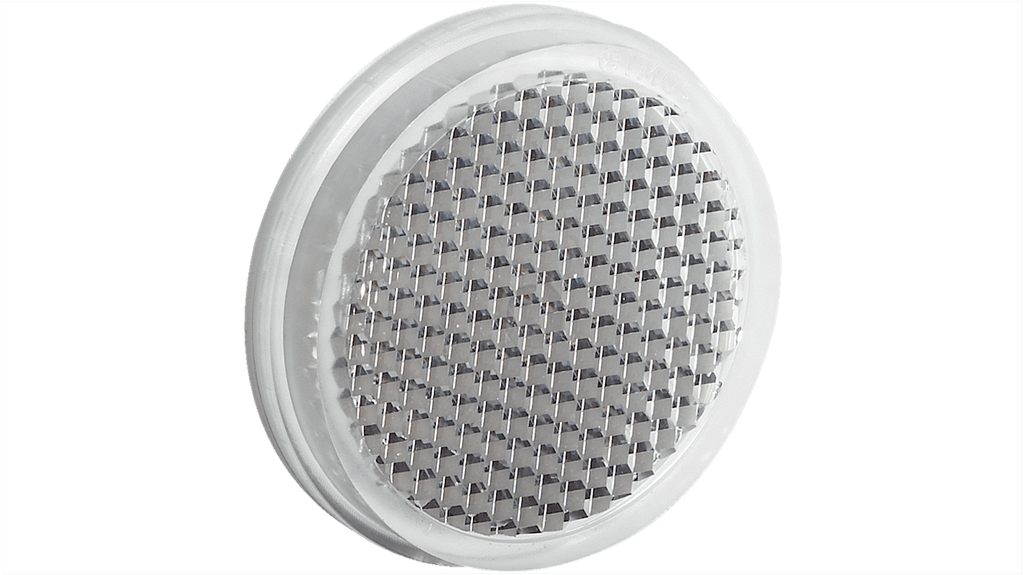 Riflettore triplo per sensori laser, diametro 25,2 mm, montaggio autoadesivo, temperatura operativa da -30 a +65 gradi Celsius, materiali PMMA e ABS. Accessorio per integrazione rapida nei sistemi esistenti, progettato per applicazioni efficienti e affidabili.