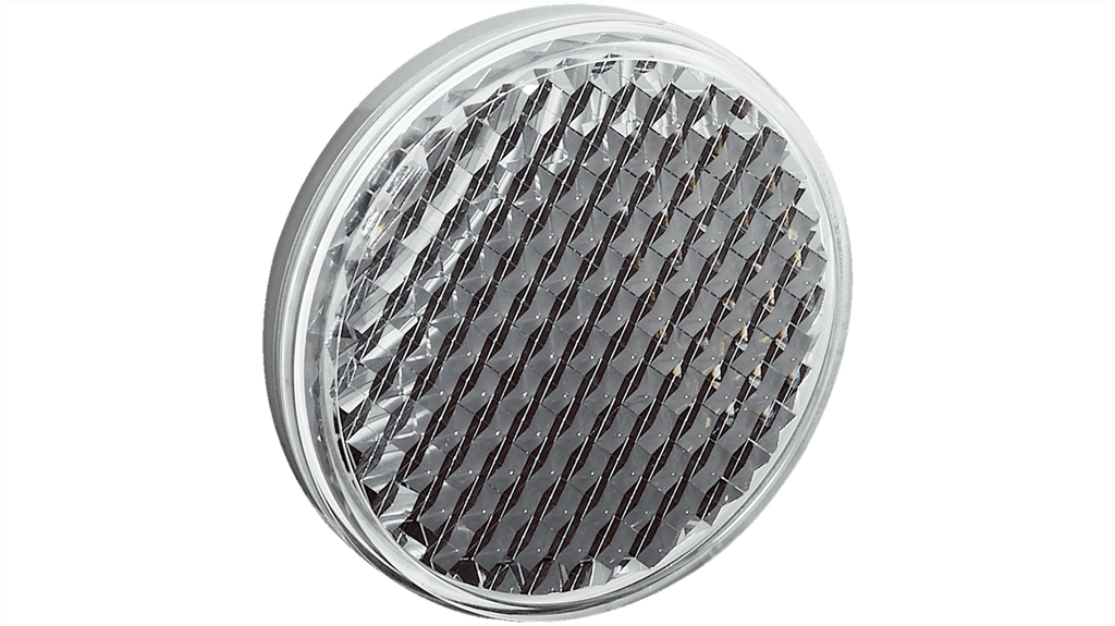 Riflettore rotondo per applicazioni industriali, montaggio a vite, bullone filettato M5x9. Materiale in PMMA/ABS. Prodotto della serie P. Tipo accessori: riflettore.