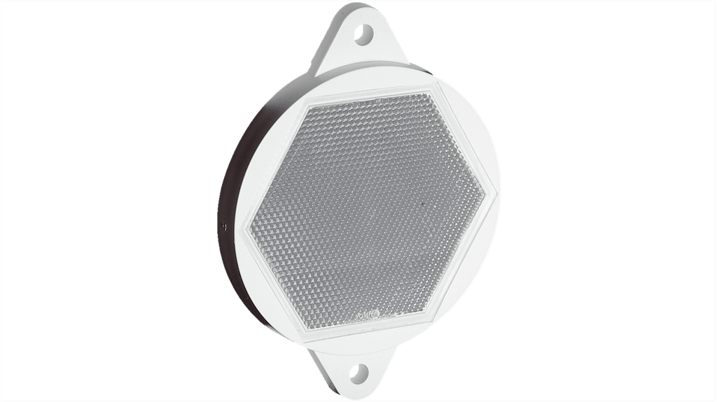 Riflettore triplo per sensori laser, diametro 63 mm, montaggio autoadesivo, temperatura operativa da -30 a +65 gradi Celsius, materiali PMMA e ABS. Accessorio per integrazione rapida nei sistemi esistenti, progettato per garantire applicazioni efficienti e affidabili.