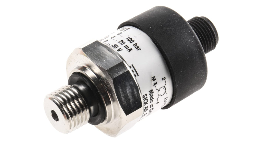 Sensore di pressione relativa Sick, trasmettitore di pressione PBT, pressione massima 100bar, uscita analogica 4-20 mA, precisione ±0,5%, grado di protezione IP67, temperatura operativa da 0 a 80 gradi Celsius, materiale custodia in acciaio inox, connessione elettrica M12, collegamento al processo G1/4, assenza di usura meccanica, design compatto, installazione rapida.
