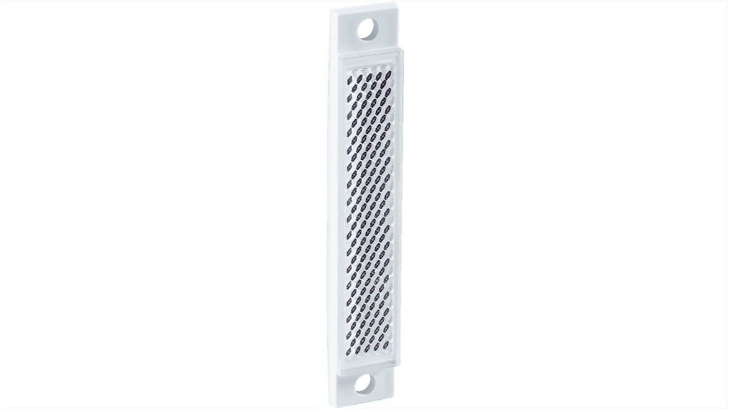 Riflettori per uso con sensori, progettati per rilevamento di materiali trasparenti, dimensioni 8 mm x 48 mm, area riflettente 15,8 x 5,8 mm, montaggio a vite con configurazione a 2 fori, foro di montaggio di 3,5 mm, grado di protezione IP67, temperatura operativa da -30 a +50 gradi Celsius, materiali PMMA e ABS.