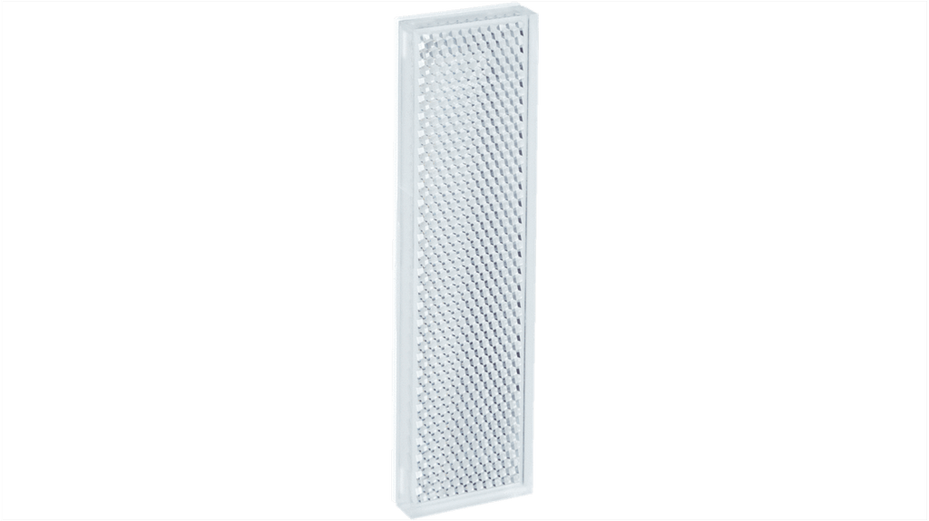 Riflettore rettangolare per uso con sensori, codice PL76F, marchio Sick, area riflettente 17 x 71 mm, grado di protezione IP 67, montaggio a telaio, materiale PMMA/ABS, temperatura operativa da -30 a +90 gradi Celsius. Accessorio ideale per il rilevamento di materiale chiaro, consente integrazione rapida nei sistemi esistenti.