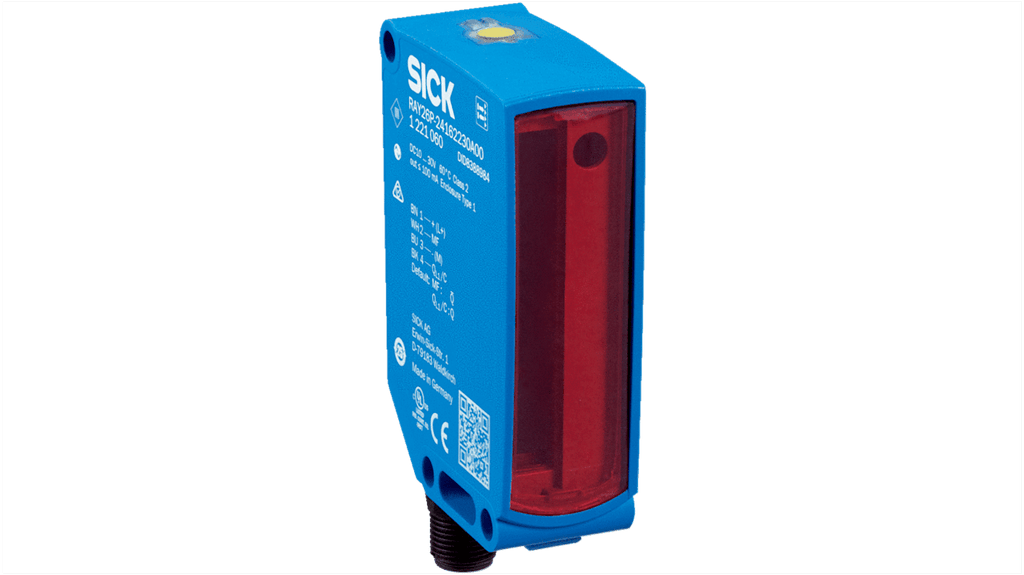 Sensore fotoelettrico rettangolare a retroriflessione, rilevamento da 0 a 1,5 m, uscita PNP, con connettore maschio a 4 pin M12. Grado di protezione IP66/IP67, tensione massima 30V, corrente massima 40 mA, tempo di risposta 3 ms. Interfaccia IO-Link V1.1, materiale custodia in plastica VISTAL, temperatura operativa da -40 a +60 gradi. Certificazioni CE e cULus. Modello RAY26.
