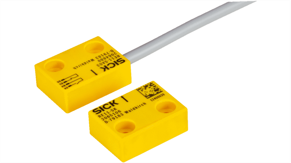 Interruttore di interblocco di sicurezza con contatti 1NC/1NA, tipo di chiusura magnete, grado di protezione IP67, materiale custodia Vistal, dimensioni 26 x 36 x 13 mm, temperatura operativa da -30 a +60 gradi Celsius, compatibile con connettore a spina M12, conforme agli standard CE, progettato per applicazioni con elevati standard igienici e tolleranze maggiori.