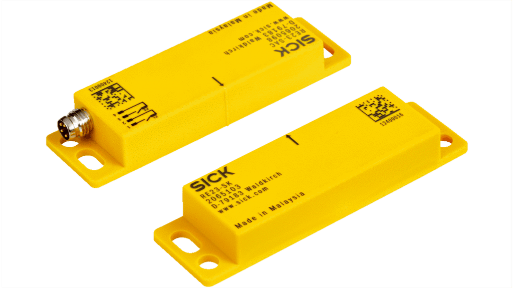 Interruttore di interblocco di sicurezza con magnete, 2 contatti N/A, grado di protezione IP67, dimensioni 25 x 88 x 13 mm, materiale custodia Vistal, temperatura operativa da -30 a +60 gradi Celsius, compatibile con connettore a spina M12, soddisfa standard CE, campo di risposta fino a 9 mm, fino a livello di prestazione PL e / Cat. 4 secondo EN ISO 13849.