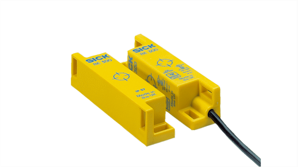 Interruttore di interblocco di sicurezza con contatti 1NA/1NC, attuatore magnetico, grado di protezione IP67, materiale custodia in Valox. Dimensioni 19 x 82 x 19 mm, temperatura operativa da -10 a +55 gradi Celsius. Collegamento tramite cavo, compatibile con soluzioni di controllo sicure. Conforme agli standard CE e EN ISO 13849, livello di prestazione PL e, Cat. 4.