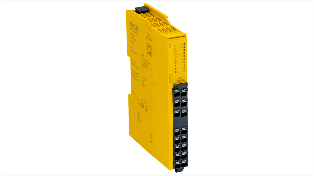 Relè di sicurezza a 2 canali, tensione di alimentazione 16.8-30V, 3 contatti di sicurezza, contatti ausiliari 3, metodo di reset automatico e manuale, profondità 18mm, lunghezza 125mm, morsetti a molla, diagnostica tramite LED di stato, conforme a EN ISO 13849 e IEC 61508. Design compatto per ottimizzare lo spazio nell'armadietto di controllo.