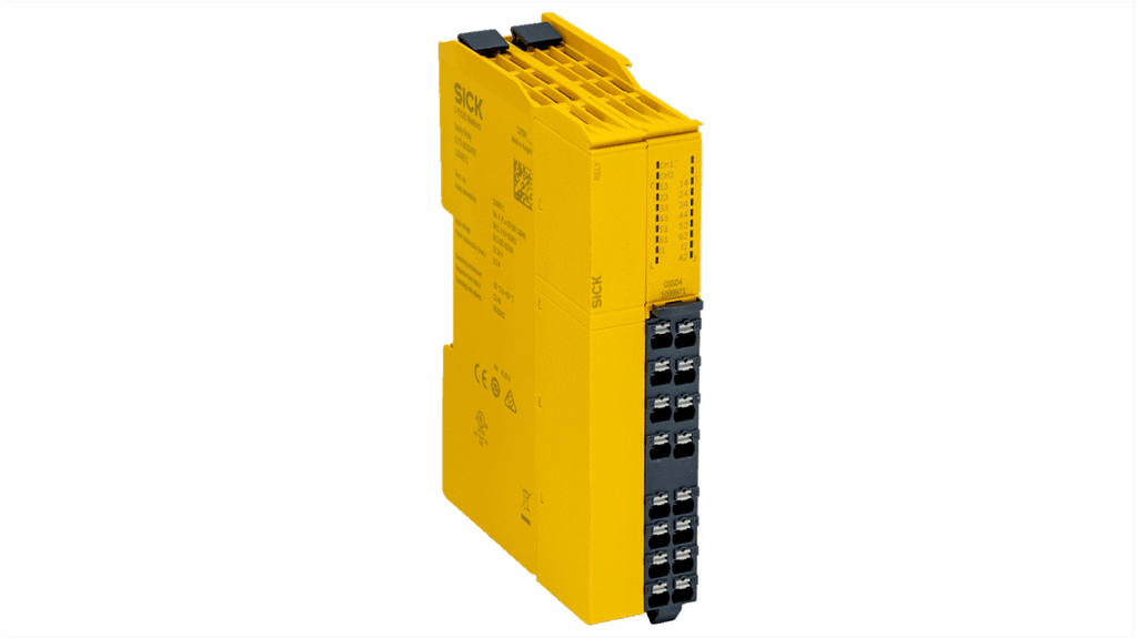 Relè di sicurezza per monitoraggio di interruttori di sicurezza, tensione di alimentazione 16.8-30V, 2 canali, 4 contatti di sicurezza, 1 contatto ausiliari, profondità 28mm, lunghezza 125mm, morsetti a molla, contenitore sottile, diagnosi tramite LED di stato, conforme a EN ISO 13849 e IEC 61508.