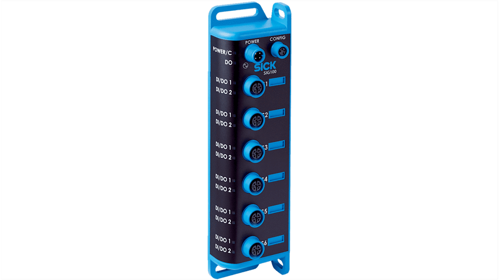 Gateway di integrazione sensore. Sei porte configurabili, ciascuna con due ingressi o uscite binarie, per un massimo di 12 I/O standard. Tensione operativa 18-30V cc, connettore M12, protocollo di comunicazione IO-LINK versione 1.1. Grado di protezione IP67, gamma di temperatura -40 a +60 gradi Celsius, peso 289g, custodia in ABS. Codice costruttore SIG100-0A0111100, marchio Sick.