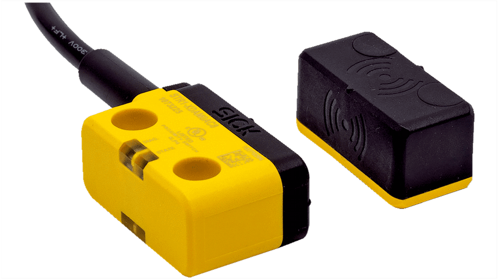 Interruttore di sicurezza Sick STR1, dotato di uscite a semiconduttore monitorate, tensione massima 24V cc, corrente massima 100mA, grado di protezione IP67 e IP69K, dimensioni 40 x 18 x 26mm, temperatura operativa da -30 a +70 gradi, materiale custodia Vistal, possibilità di collegamento in serie fino a 30 sensori, attuatore incluso, standard CE, attivazione da tre lati, flessibilità di montaggio.