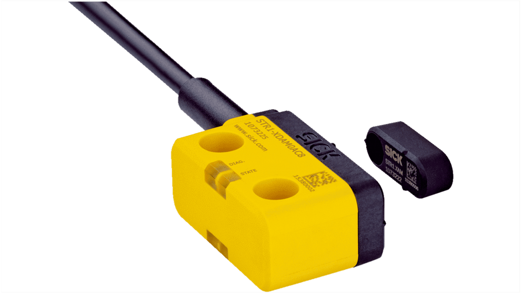 Interruttore di sicurezza con uscite a semiconduttore monitorate, grado di protezione IP67 e IP69K, tensione massima 24V cc, corrente massima 100mA, dimensioni 40 x 18 x 26mm, attuatore incluso, materiale custodia Vistal, temperatura operativa da -30 a +70 gradi, collegamento in serie fino a 30 sensori, standard CE, compatibile con attuatori codificati universalmente.