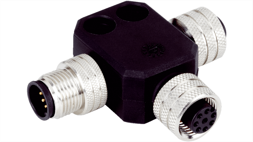 Connettore T-Piece M12 per collegamento sicuro in serie, compatibile con STR1. Realizzato in polipropilene, dotato di dado di bloccaggio. Grado di protezione IP68. Tipo accessori: connettore T-Piece.