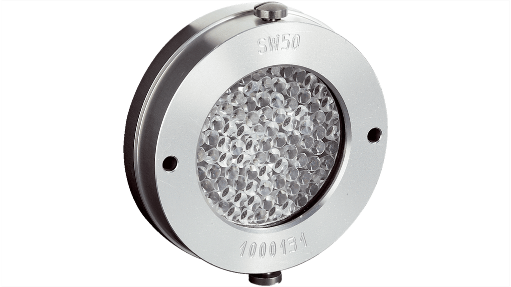 Riflettore per alte temperature, modello SW50, marchio Sick. Tipo di montaggio a vite, realizzato in alluminio anodizzato. Progettato per applicazioni industriali con vetro resistente. Specifiche tecniche: accessori, riflettore, serie SW.