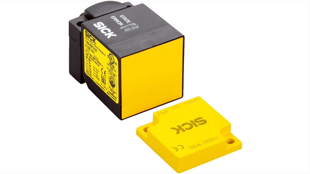 Interruttore di interblocco di sicurezza Sick T40, IP67, 0,4A, attuatore incluso, tensione massima 24V cc, corrente massima 0,4A, tipo di connessione M12, materiale custodia plastica, dimensioni 40 x 57 x 40mm, temperatura operativa da -20 a +55 gradi, grado di protezione IP67, serie T40, standard CE. Consente collegamento in serie fino a 20 sensori, indicatori di stato a LED.