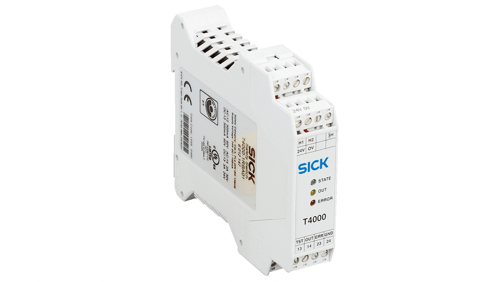 Relè di sicurezza Sick, tensione di alimentazione 24V cc, serie T4000, alto livello di codifica, terminali a innesto, indicazione di errore. Per dettagli specifici consultare la scheda tecnica.