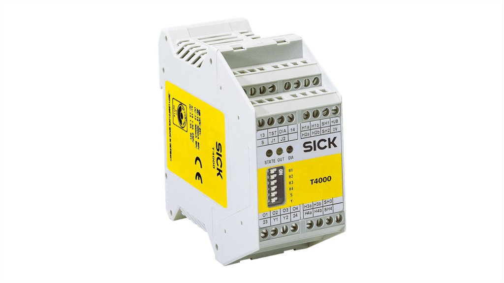 Interruttore di sicurezza a transponder Sick T4000, IP20, tensione 24V cc, corrente massima 1,2A, custodia in plastica, dimensioni 45 x 114 x 99 mm, temperatura operativa da 0 a 55 gradi, collegamento fino a quattro sensori a un'unità di valutazione, conforme a CE, livello di prestazione PL e secondo EN ISO 13849, montaggio salvaspazio, resistenza agli urti e alle vibrazioni.