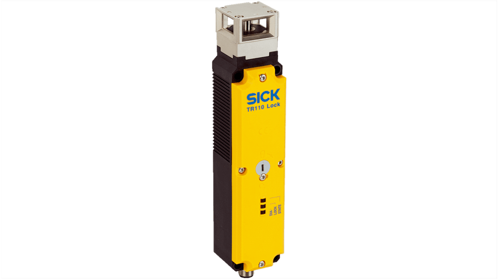 Interruttore di sicurezza Sick TR110, alimentazione 24V cc, corrente massima 150mA, grado di protezione IP67 e IP69K, dimensioni 42 x 190 x 40mm, materiale custodia in termoplastico rinforzato con fibra di vetro, forza di chiusura fino a 3900 N, attuatore con alto livello di codifica, sblocco di emergenza opzionale, varianti con due pulsanti illuminabili, standard CE, temperatura operativa da -20 a +55 gradi.
