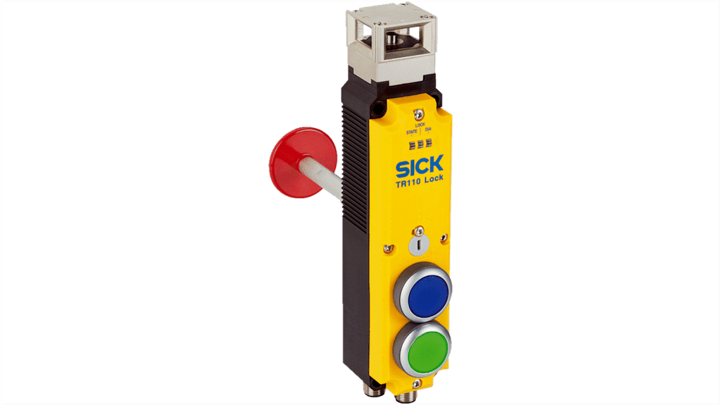 Interruttore di interblocco di sicurezza, alimentazione 24V cc, corrente massima 150mA, grado di protezione IP65, materiale custodia in termoplastico rinforzato con fibra di vetro, dimensioni 190 x 56 x 40mm, temperatura operativa da -20 a +55 gradi, forza di chiusura fino a 3900N, conforme a EN ISO 13849 e EN ISO 14119, codice costruttore TR110-SRU2B01.
