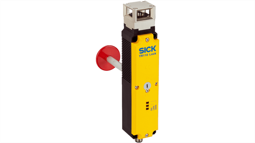Interruttore di interblocco di sicurezza, alimentazione 24V cc, corrente massima 150mA, grado di protezione IP67 e IP69K, dimensioni 190 x 42 x 40mm, materiale custodia in termoplastico rinforzato con fibra di vetro, forza di chiusura fino a 3900N, attuatore con alto livello di codifica, sblocco di emergenza opzionale, standard CE, temperatura operativa da -20 a +55 gradi Celsius. Codice costruttore TR110-SRUSA01, marchio Sick.