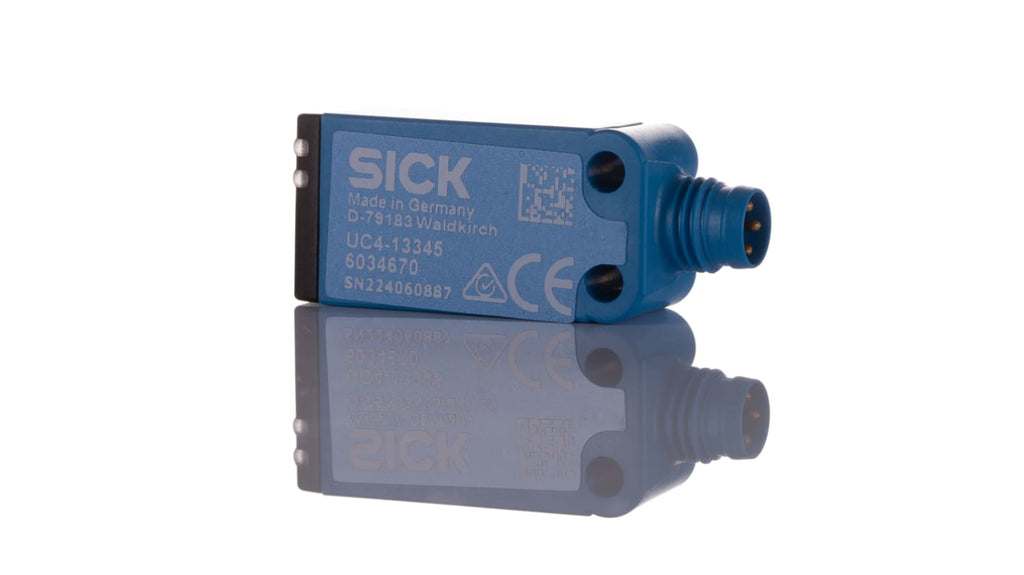 Sensore di prossimità a parallelepipedo, tecnologia a ultrasuoni, uscita NPN, gamma di rilevamento 13.150 mm, tensione di alimentazione 15-30 V, corrente di commutazione 200 mA, grado di protezione IP65/IP67, temperatura operativa da -25 a +70 gradi, dimensioni 16.7 mm x 16 mm x 40.1 mm, materiale custodia plastica, pulsante teach-in, immune a sporcizia e umidità. Codice costruttore UC4-13345, marchio Sick.