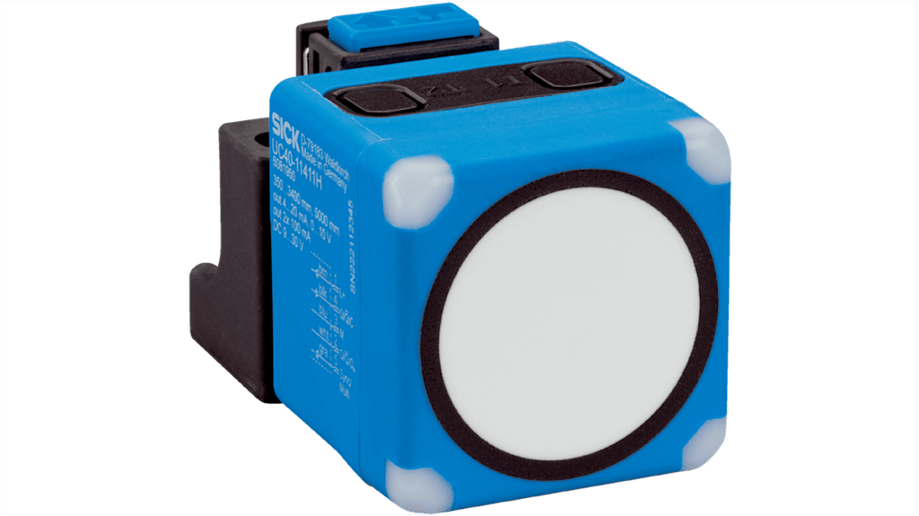 Sensore a ultrasuoni compatto per medie distanze, rilevamento di distanza, presenza e posizione, campo di misura fino a 5000 mm, uscita digitale PNP/NPN, IO-Link, connettore M12, grado di protezione IP65/IP67, temperatura operativa da -25 a +70 gradi, corrente massima 100 mA, tempo di risposta 160 ms, materiale custodia plastica, montaggio push-lock, serie UC40, conforme CE.